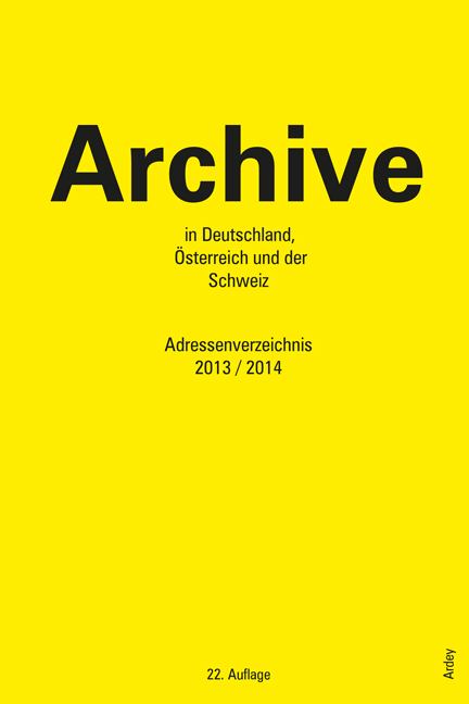 Archive in Deutschland, Österreich und der Schweiz. Adressenverzeichnis 2013/2014, Ardey-Verlag, Münster 2013 [ISBN 978-3-87023-413-3], 268 S., Broschur, Format: 16,8 cm x 24,0 cm, mit CD-ROM, € 35,-